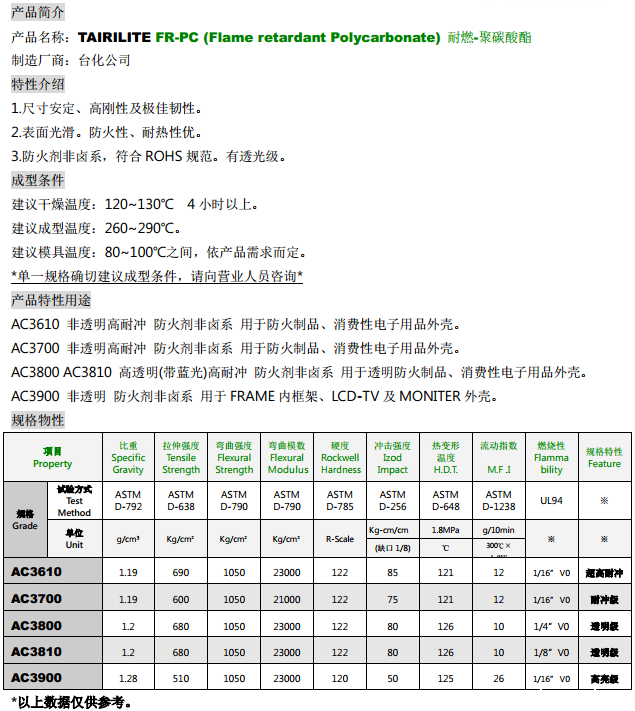 | AC3831 | 1.低流動性 2.押出用途 3.非鹵系、符合RoHS規範 4.符合UL 1.0mm V-0 | LED燈管用 | |