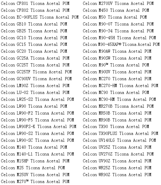 Celcon® POM产品有不同粘度的非填充级品级,以及玻纤增强、冲击改性、抗UV、低光泽、静电消散、低磨耗、抗漂白剂和可激光雕刻等特殊品级。有些特殊品级为燃油系统和供水管道应用提供了特别优异的性能。Celcon® 有符合FDA、UL和NSF标准的品级。符合美国药典VI的医疗(MT™)品级是干粉吸入器、胰岛素笔和其它医疗设备用材的杰出候选者,并已在美国药物主文件档案中列档(DMF,No.16661)。所有Celcon® 产品都可以进行几乎任何一种配色,而且色料不含有重金属元素,如镉、汞、铅、铬(VI)等。由于它的多功能性,Celcon® 产品被广泛地应用在各种领域中,比如齿轮、弹簧、夹子、卡扣、门把、燃油系统部件的衬垫、玩具元件、洗衣机元件、手动工具部件、淋浴莲花篷头、安全带卡扣等。Celcon® 亦可以用来制备薄板、圆棒和厚板等坯型材,并可通过机加工来制造高精度零件。