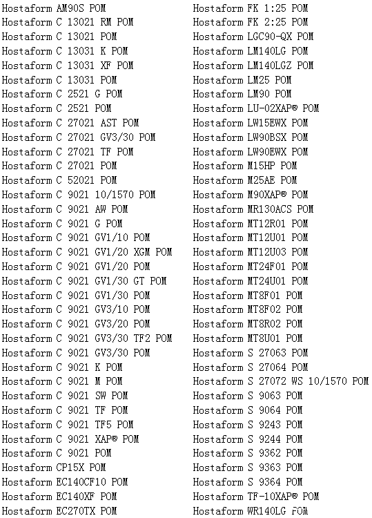 Hostaform® POM有不同粘度的非填充级品级,以及玻纤增强、冲击改性、抗UV、低光泽、静电消散、低磨耗和可激光雕刻等特殊品级。其它一些特殊品级,比如Hostaform® XAP(低气味级)、XF(耐高温柴油级)和MR130ACS(改良耐氯和耐强清洁剂级),进一步拓展了它的产品系列。Hostaform® POM大多数品级符合FDA标准和EU标准(2002/72 EC),Hostaform普通品级已经根据WRAS、KTW和NSF标准成功地进行了饮用水测试。符合美国药典VI的医疗(MT™)品级是干粉吸入器、胰岛素笔和其它医疗设备用材的杰出候选者。Hostaform® MT品级已在美国药物主文件档案(DMF,No.11559)中列档。所有Hostaform® 产品都可以进行几乎任何一种配色,而且色料不含有重金属元素,如镉、汞、铅、铬(VI)等。